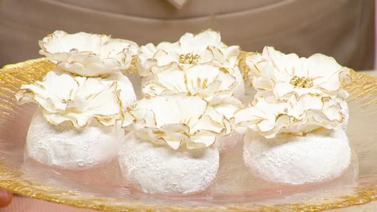 - -نُحضر عجينة السكر البيضاء نَفتحها بشكل رقيق، نُحضر طابع على شكل وردة، ونُشكل به عدة وردات.