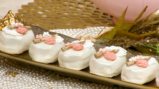 - -نتركها حتى تَجف عليها الشوكولاطة البيضاء، ثم نُزينها بالأزهار ونضع فوقها القليل من المُلون الغذائي الذهبي كلمسة جميلة.